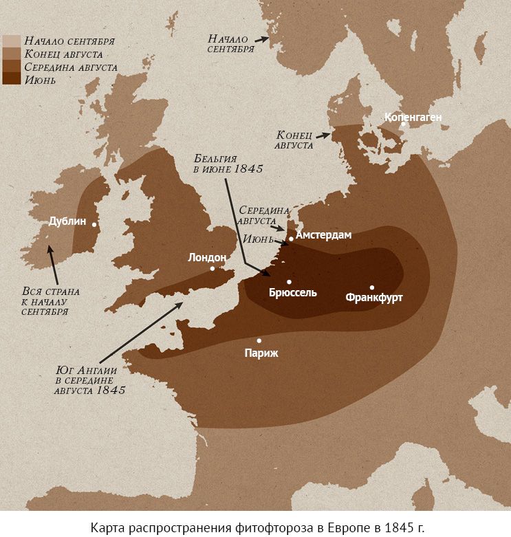 11 сентября 1845 года в местной газете The Freeman’s Journal вышла примечательная заметка. В ней говорилось об ирландском фермере, собравшем новый урожай, который сгнил всего за одну ночь. Весь труд фермера оказался напрасным. Виноват был фитофтороз – грибковое заболевание картошки.