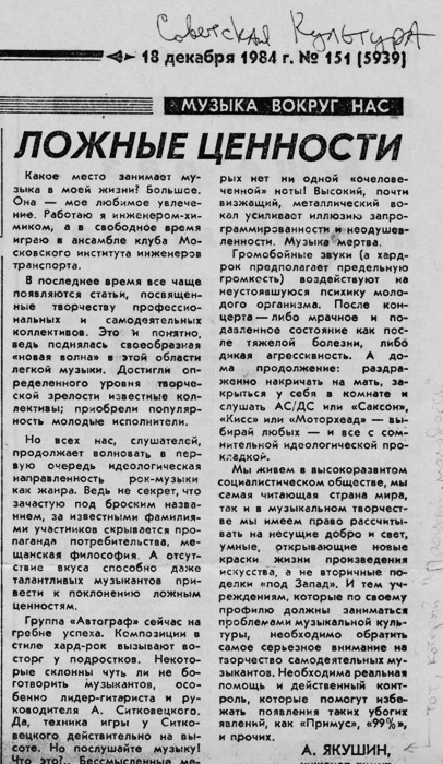 Они, сволочи, строили свою собственную карьеру, как, например, лидер группы «Прощай, Молодость!» Андрей Якушин, написавший в «Советской культуре» откровенный идеологический донос на группу «Автограф». Слава Богу, у Сита все тогда обошлось, но так везло далеко не всем.