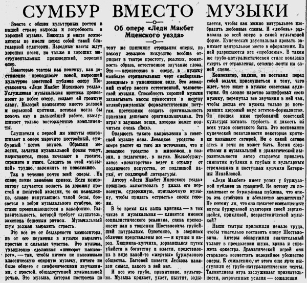 Но, если вы думаете, что это «ноу-хау» относится лишь к 80-м, то я вас удивлю, и напомню, как таким же образом в 40-е размазали Ахматову и Прокофьева, и даже несколько доносов критика Давида Заславского в предыдущие десятилетия. Именно такие перлы, как «Сумбур вместо музыки», опубликованный в «Правде» 28 января 1936 года и раздавивший Дмитрия Шостаковича, позволили этому мерзавцу «проканать за своего» и выжить во время обеих волн государственного террора.