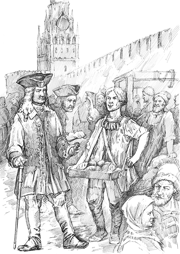 Мальчик Алексашка Меншиков торгует пирогами у дворца