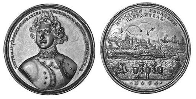 Медаль в память взятия Азова. 1696 год. Надпись на реверсе: «Молниями и волнами победитель»