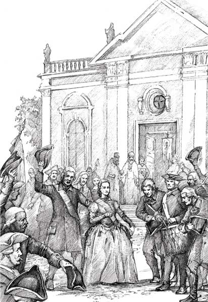 Екатерина, конечно, тоже не могла знать – как. Но вот предание о том, как Елизавета вырядилась ради власти в гвардейский мундир, до Екатерины, конечно, дошло. Тем более что дочь Петра Великого, и став императрицей, кокетничала отвагой, ею проявленной тогда, 25 ноября 1741 года, и могла снова и снова рядиться в гвардейца даже на балу – во время так называемых «метаморфоз», в ходе которых мужчины обряжались женщинами и наоборот. Придворных дам она заставляла тоже надевать военную форму – скорее из ехидства, чтобы посмеяться над нелепыми их фигурами: самой-то Елизавете Петровне, хоть она худышкой и не была, мундир приходился к лицу и стану.