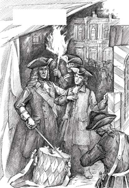 Век XVIII. Ночь 25 ноября 1741 года. Зимний дворец. Лесток и Елизавета в гвардейском мундире у барабана