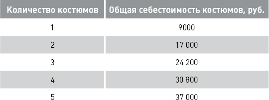 6. Определить среднюю себестоимость одного костюма, если всего изготовлено пять костюмов.
