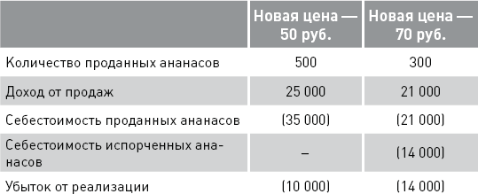 Предположим, что снижение цены на 50 % позволит распродать весь остаток, в то время как установление цены на уровне закупочной (то есть 70 руб. за 1 шт.) поможет продать только 300 шт. ананасов.