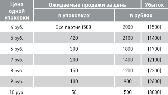 Если оставить цену на текущем уровне (10 руб. за одну упаковку), то убыток составит 3000 руб. При снижении продажной цены до уровня закупочной величина убытка станет равной 2100 руб. (1400 руб. – 3500 руб.).