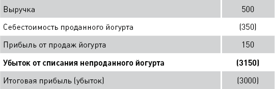 [Закрыть].Обратите внимание: если руководство супермаркета не предпримет никаких оперативных мер в данной ситуации (то есть оставит продажную цену на уровне 10 руб.), убыток от списания непроданного йогурта будет показан в отчете о прибылях и убытках отдельной строкой и неизбежно привлечет к себе внимание (хотя и постфактум). В этом отчете будут отражены следующие данные, руб.: