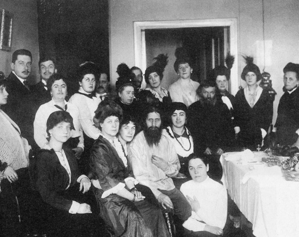 Распутин и его поклонники (Санкт-Петербург, 1914 год). В верхнем ряду (слева направо): А. А. Пистолькорс (в профиль), А. Э. Пистолькорс, Л. А. Молчанов, Н. Д. Жевахов, Э. Х. Гиль, Н. Д. Яхимович, О. В. Ломан, Н. Д. Ломан, А. И. Решетникова. Во втором ряду: С. Л. Волынская, А. А. Вырубова, А. Г. Гущина, Ден Ю. А., Е. Я. Распутин. В последнем ряду: З. Тимофеева, М. Е. Головина, М. С. Гиль, Г. Е. Распутин, О. Клейст. Сидит на полу: А. Н. Лаптинская.