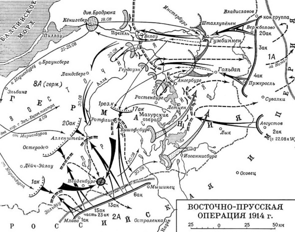 Мазурское сражение. Немецкое командование решило нанести удар по южному флангу 1-й армии, где находился лишь один 2-й корпус. Планировалось прорвать здесь фронт, выйти в тыл 1-й армии, оттеснить её к морю и болотам Нижнего Немана и там уничтожить. Начальник штаба 8-й немецкой армии Эрих Людендорф направил три корпуса и две кавалерийские дивизии на Летцен в обход русского южного фланга, а четыре корпуса – севернее озёр.