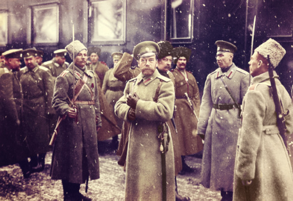 Николай II в окружении офицеров на платформе станции, январь 1916 года