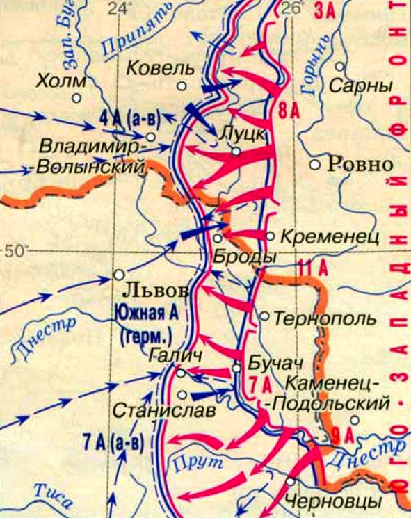 Подстраиваясь к изменяющимся срокам наступления Западного фронта, Брусилов давал 8-й армии всё новые директивы – то наступательного, то оборонительного характера, развивать удар то на Ковель, то на Львов. Наконец, Ставка Верховного главнокомандующего определилась с направлением главного удара Юго-западного фронта и поставила ему задачу: направление главного удара на Львов не менять, а по прежнему наступать на северо-запад, на Ковель, навстречу войскам Эверта, нацеленным на Барановичи и Брест.