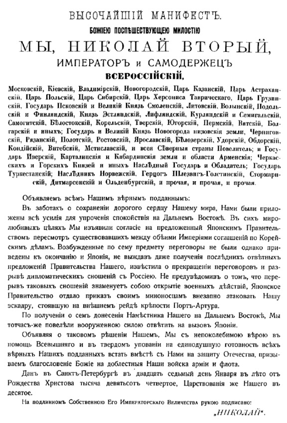 Высочайший манифест о начале войны с Японией