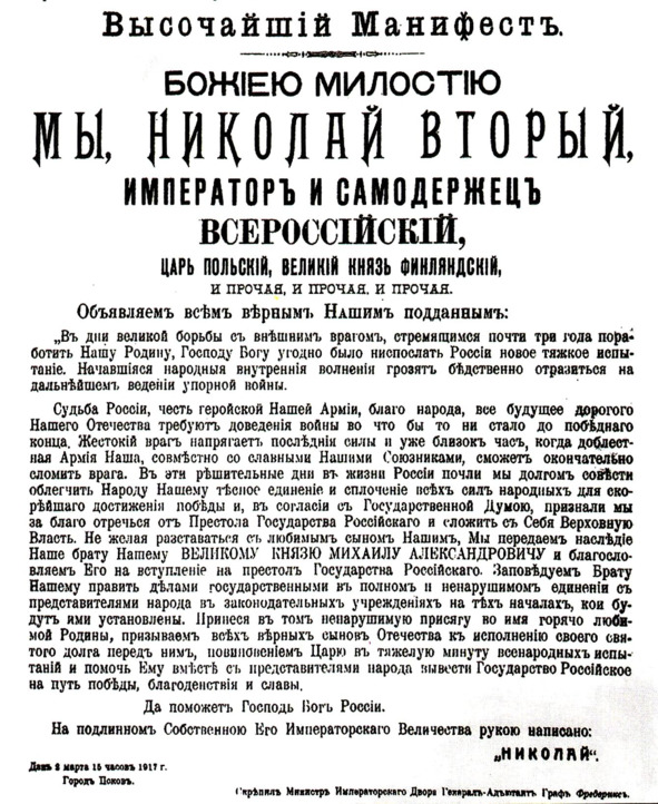 В эти решительные дни в жизни России почли мы долгом совести облегчить народу Нашему тесное единение и сплочение всех сил народных для скорейшего достижения победы и, в согласии с Государственною думою, признали Мы за благо отречься от престола государства российского и сложить себя верховную власть.