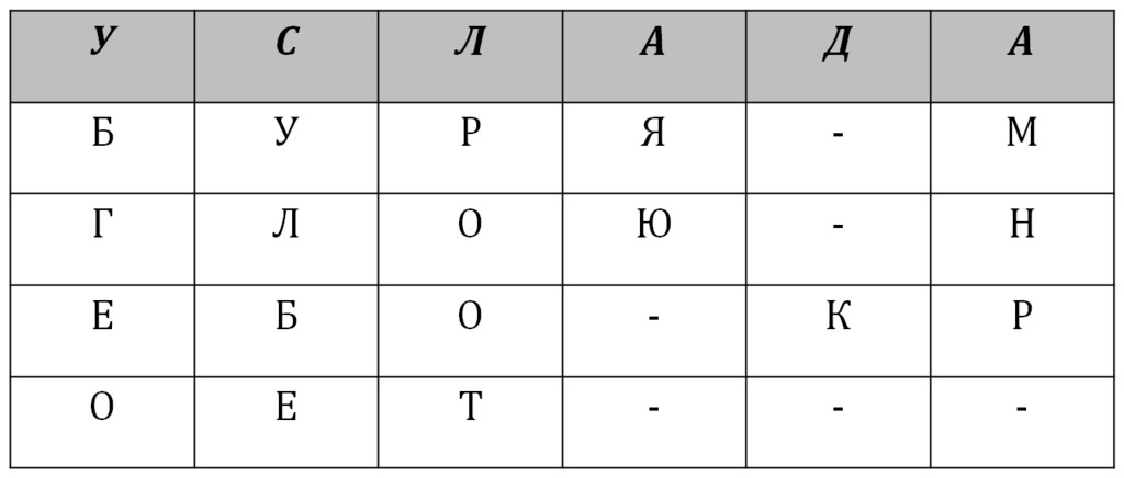 – Пропуски между словами обозначались прочерками. Потом придумывали слово-ключ, состоящее из шести букв и писали его сверху: