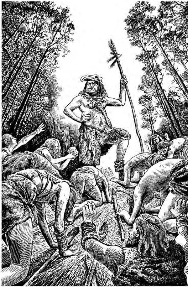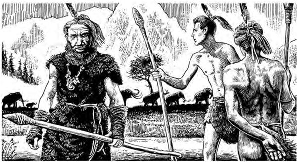Левая рука сжимала копьё с каменным наконечником. Человек втягивал носом воздух, подставляя под ветер широкие ноздри.