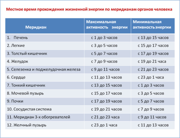 Вся работа человеческого организма связана с жизненной энергией, которая движется по особым энергетическим каналам, и соединяет все тело с внутренними органами, и сами органы между собой. При этом наблюдается периодичность максимального пополнения энергии к различным меридианам продолжительностью в 2 часа.