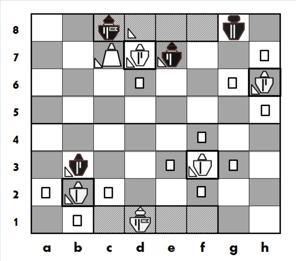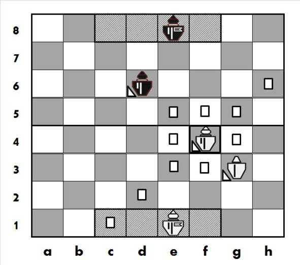 Сразу обратим внимание, здесь наряду с белыми прямоугольникам определенные клетки отмечены белыми треугольниками. Белыми прямоугольниками (как это уже было использовано в главе 2) отмечены поля подвижности белых Кнехтов и Вер Кнехтов, это клетки на которые эти фигуры могут сделать ходы. Как мы уже знаем, эти же поля также находятся под их силовым воздействием. То есть, прямоугольник фиксирует сразу два свойства фигуры: подвижность (здесь – возможность хода) и силовое воздействие.