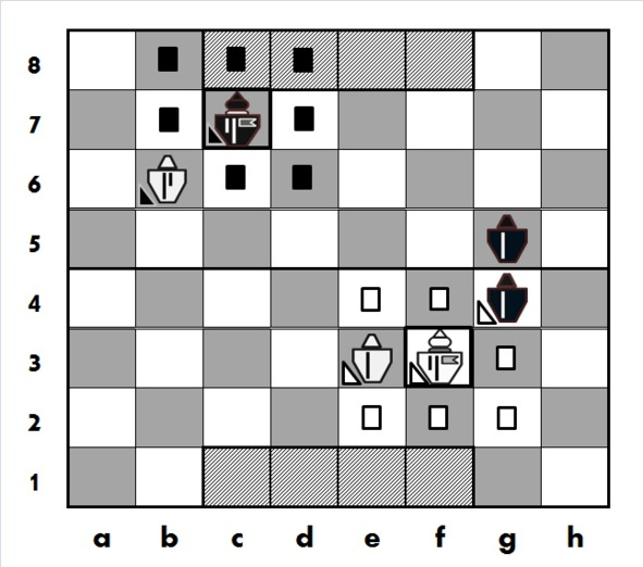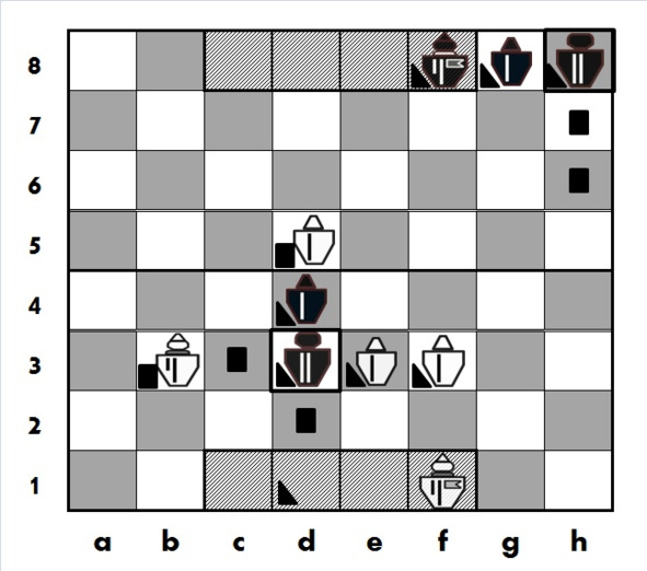 Обратим внимание на поле b4, никак не отмеченное, которое в отсутствие «препятствия» на b3 было полем подвижности белого Кнехта. Теперь же, в силу того, что Кнехт не может перепрыгивать через занятые клетки на своей линии движения, на это поле его ход не возможен, и также сюда не распространяется его силовое воздействие.