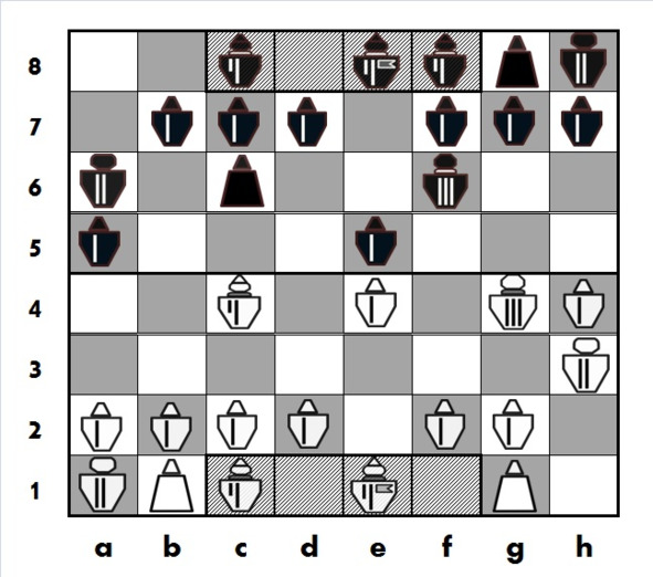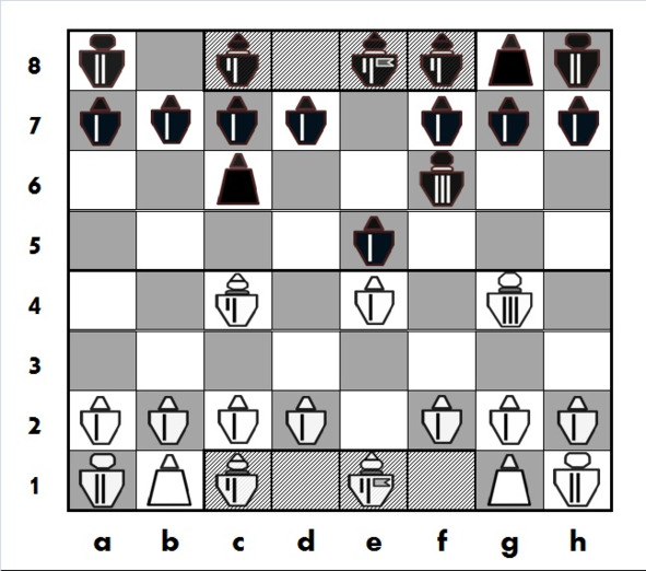 6-й ход: белые и черные классически, «по-шахматному», развивают свои фигуры, белые – Разведчика, черные Принца. Обе фигуры при этом берут под контроль центральные поля.