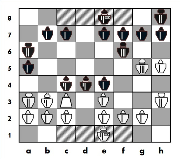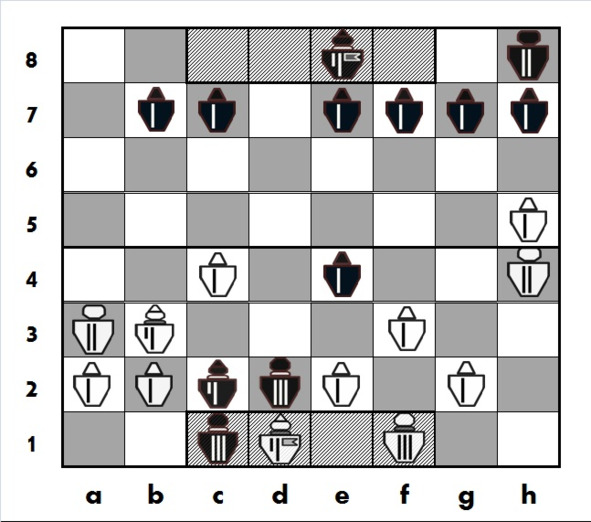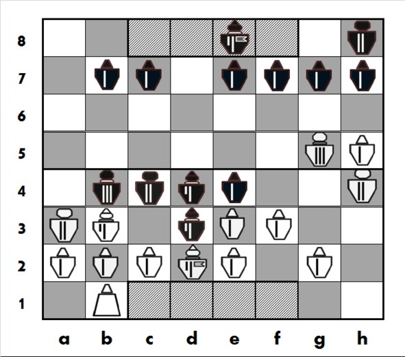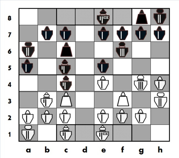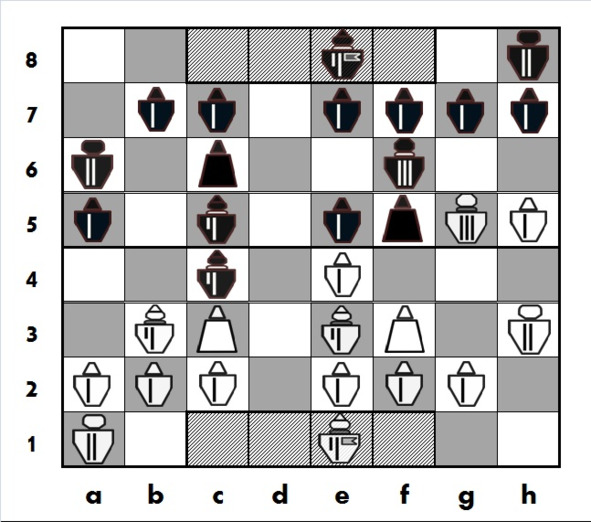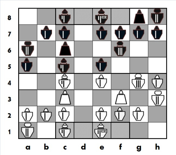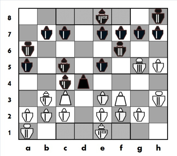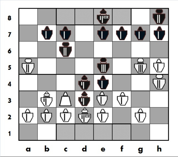 Черные усиливают давление в центре, берут «на прицел» белого Принца на e3, планируют атакующий ход Рк c6-d4 с угрозой белому Принцу на b3. Белым против этих планов нужно что-то предпринимать, однако они ошибаются, пренебрегая опасностью от активной игры черных в центре..