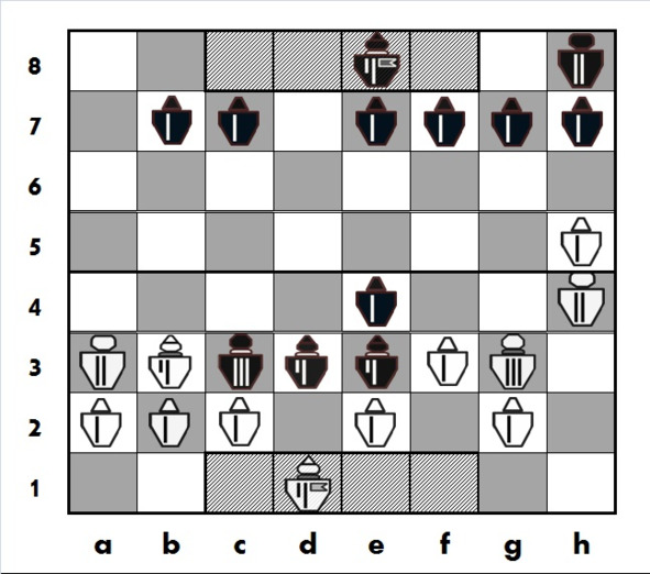 7-й ход: Белые вводят в игру Разведчика, аналогично нацеливаясь на центральные поля. А вот черные «боковым» ходом «пешки» (7. … d7-e7) делают маневр, характерный для chess-Т1, на который следует обратить внимание. Этим маневром черные открывают «дорогу» своему Принцу на c8, чтобы он следующим ходом занял важный пункт вблизи центра – e6. Еще один смысл хода d7-e7: черный Кнехт не отрывается от своего замка, прикрывая его, а также добавляет свою силовую защиту черному Королю.