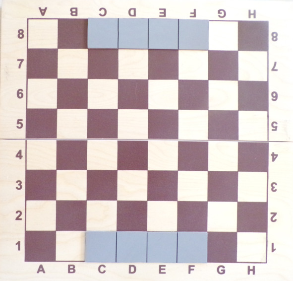 На рис. П3.1 (снимок не совсем хорошего качества) показан способ получения игрового поля chess-Т1 из деревянной шахматной доски с помощью двух, расчерченных на клетки, полосок из тонкого гибкого пластика. Полоски, как показано на рисунке, просто накладываются на шахматную доску, не повреждая ее. Вместо пластика могут использоваться полоски, например, из цветного картона, как показано в издании [1].