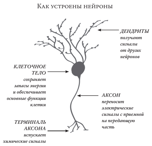 [Закрыть]. Для этого они часто применяют одни и те же механизмы. Базовая единица обработки информации, нейрон, – это изумительная клетка, которая ловко умеет накапливать данные о том, что происходит в окружающем ее мире. При этом она отправляет свой «краткий отчет» о положении вещей дальше по цепочке коммуникации. На принимающем конце каждого нейрона расположен пучок ответвлений – дендритов[41]41