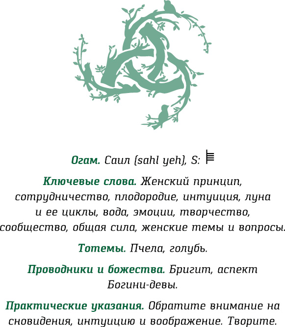 Бригит хранит секреты женского принципа. Она хранительница луны, лунных и всех прочих циклов. Хранительница магии плодородия и творения, а также секретов мистерии крови. Бригит защищает достоинство женщин и понимает магию рождения – как рождения людей, так и воплощения творческих замыслов. Ива защищает, питает и оберегает. Она знает о вашей боли и положении женщин на нашей планете. Знает, от чего вы стремитесь исцелиться.