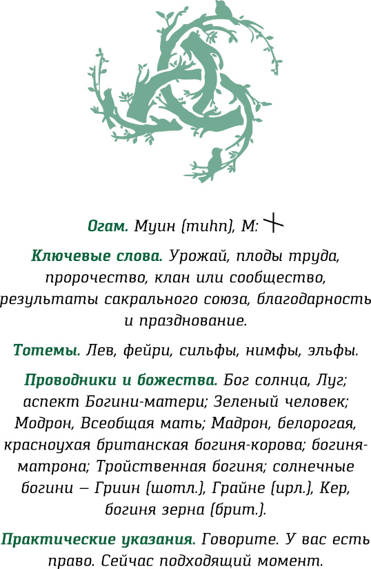 Портал Муина/Винограда – отличное время, чтобы записать воспоминания о покойных родственниках. Это пора семейных встреч и обмена историями о предках и родных. Так вы сможете связаться с ними или умершие сами посетят вас. Они вас слышат и помогают вам. Стоит подумать о них и вспомнить хорошие времена. Они живы, пока вы их почитаете. Они ценят вашу память. Они стремятся связаться с вами и даровать любовь и поддержку, если вы достаточно открыты.
