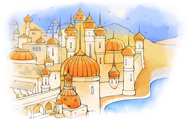 А вот что. Преследуя на охоте оленя, Нурадин-Фридон далеко ушёл от своих егерей и остался в полном одиночестве. Вдруг видит: стоит неподалёку на поросшем кустарником пригорке открытый сундук, а рядом с ним – печальная луноликая красавица. До глубины сердца поражённый её несказанной прелестью, он окликнул незнакомку и стремглав устремился к ней, но ещё быстрее оказались две какие-то тени, двигающиеся так молниеносно, что подробностей не различишь. Мелькнула на мгновение перед глазами пара отвратительных лиц – и всё. Крышка сундука захлопнулась, а потом увидел Нурадин-Фридон, как отплывает небольшой парусник, швартовавшийся у пристани, – вон она, там…
