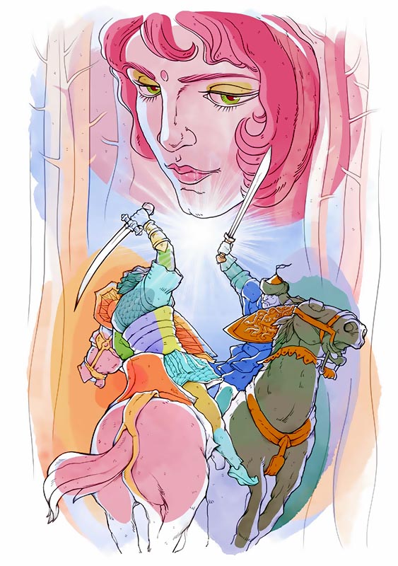 Его свита заволновалась, но он подал ей знак сохранять спокойствие. То же приказал своим людям и Тариэл, поднимая тяжёлый булатный меч. Всадники ринулись навстречу друг другу.