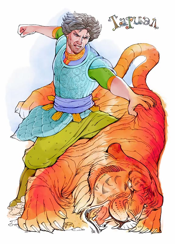 Широко раскинув руки, Тариэл кинулся навстречу тигрице и крепко-накрепко обхватил её. Та рычала, рвала когтями одежду и тело противника, но вырваться из могучих объятий не смогла и в них окончила свой век. Путь в пещеру был свободен.