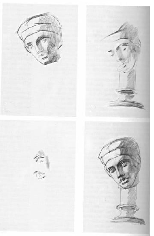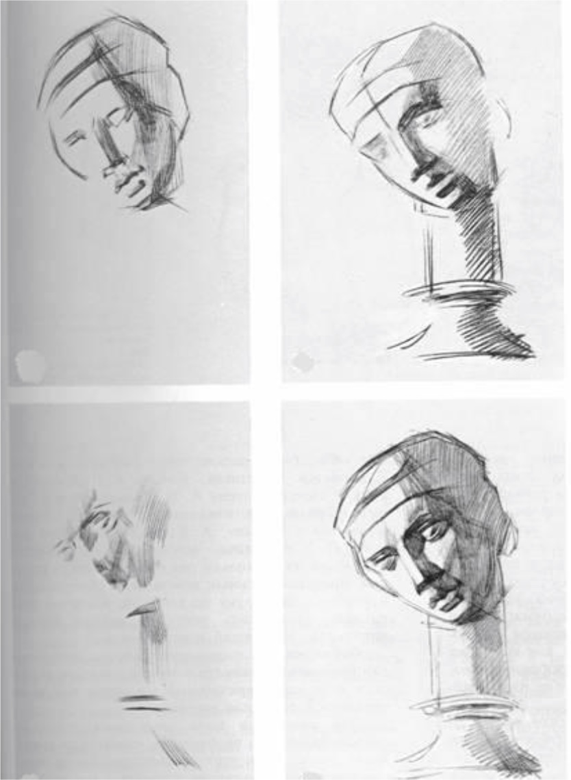 61– rasm. Gipsdan yasalgan boshni chizish bosqichlari (Е. Ignat’ev metodi).