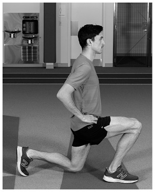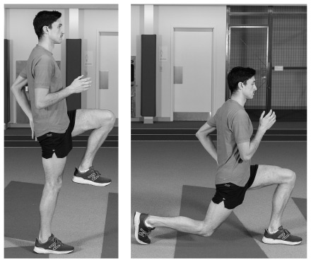 Сделайте широкий шаг вперед правой ногой примерно на 60 см, позволяя при этом левой пятке естественным образом приподняться. Постарайтесь двигать руками естественно, согнув их в локтях под углом 90 градусов. Держите мышцы корсета напряженными и туловище в вертикальном положении. Согните оба колена, опустив заднее колено к земле. Остановитесь, не касаясь коленом пола. Опускаться к полу следует на вдохе.