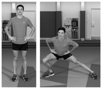 В полуприседе перенесите вес тела на одну ногу и сделайте шаг в сторону другой ногой. Во время выполнения упражнения держите бедра ровно. Старайтесь держать туловище наклоненным вперед. Спина должна быть прямой, а не округлой. Вы должны почувствовать напряжение в бедрах. Сделайте 10 шагов вправо, затем 10 влево.
