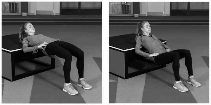 Как выполнять это упражнение. Сядьте на пол, прислонившись спиной к длинному краю гимнастической скамьи или другой опоры, например дивана или стула, и поставив стопы на пол. Верхняя часть скамьи должна располагаться прямо под лопатками. Задействовав мышцы корсета и опираясь на пятки, поднимите бедра вверх, держа подбородок опущенным, чтобы не допустить чрезмерного прогиба спины. В верхней точке подъема сильно сожмите ягодицы, а затем медленно опустите их, не касаясь пола. Выполните от 10 до 15 повторов.