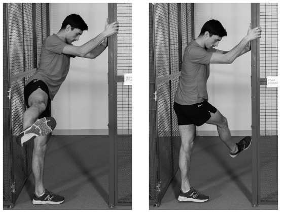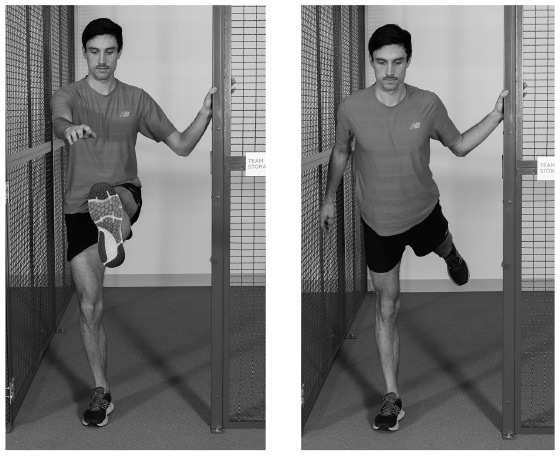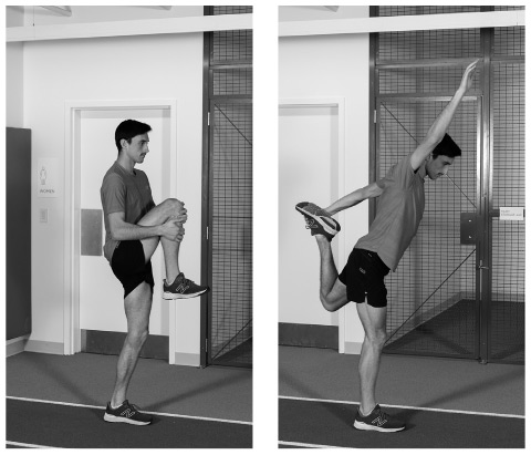 Как выполнять это упражнение. Обопритесь левой рукой на опору с левой стороны, например на стул или стену. Бедра и плечи должны смотреть строго вперед. Поднимите левую ногу, слегка согните ее в колене и подтяните колено как можно выше. Затем махните ногой назад, полностью разогнув ее за спиной. Вы должны отводить ногу назад с некоторым усилием, чтобы имитировать бег, но преувеличивать движение, чтобы получить полное растяжение на каждом конце диапазона гибкости. Выполните две серии по 10 упражнений для каждой ноги.