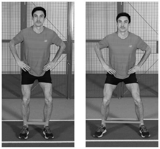 Как выполнять это упражнение. Наденьте небольшую ленту на обе лодыжки. Поставьте ноги на ширине бедер. Лента должна быть натянута, но не слишком. Слегка согните колени в полуприседе, чтобы активизировать ягодицы. Держите стопы на одной линии с бедрами и смотрите вперед, равномерно распределяя вес тела на обе ноги.