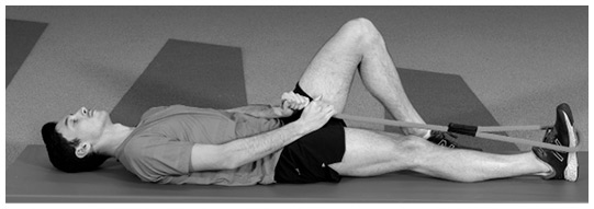 Как выполнять это упражнение. Лягте на спину, вытянув обе ноги вперед. Обхватите с внутренней стороны левую стопу петлей из ремня, затем пропустите ремень под левой голенью. Концы ремня находятся на внешней стороне левой ноги. Зафиксируйте левое колено и слегка поверните левую ногу внутрь.