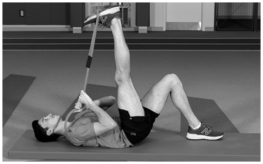 Как выполнять это упражнение. Лягте на спину, согнув одно колено и поставив стопу на землю. Сделайте петлю из ремня и поместите ее на нижнюю часть стопы прямой ноги. С помощью четырехглавой мышцы поднимите ногу как можно выше, направив стопу вверх. Возьмитесь за концы ремня обеими руками и поднимитесь по ней, сохраняя натяжение. В конце упражнения при помощи ремня мягко усильте растяжку. Опустите прямую ногу на пол. Каждый повтор должен занимать всего несколько секунд. Выполните 10 повторов на каждую ногу.
