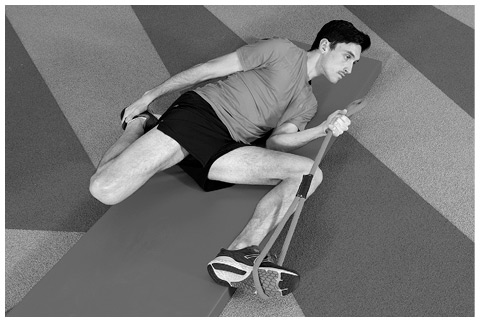 Как выполнять это упражнение. Лягте на бок, подогнув колени к груди. Положите нижнюю руку под бедро нижней ноги и обхватите ею внешнюю сторону стопы или используйте ремень, чтобы удерживать нижнюю ногу. Верхней рукой возьмитесь за подъем стопы верхней ноги. Держите колено согнутым, а ногу параллельной поверхности, на которой лежите.