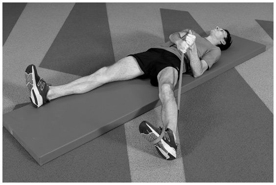 Как выполнять это упражнение. Начните так же, как и при растяжке бицепса бедра на прямой ноге, только после того, как вы закрепите петлю вокруг стопы, оберните ремень вокруг ноги так, чтобы он повернул стопу наружу. Теперь сделайте то же движение, что и при растяжке на прямой ноге, направив стопу наружу. Выполните по 10 повторов на каждую ногу.