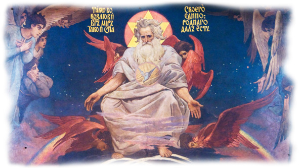 Так, над дедулькой довольно подробная надпись жирными буковками, понятно конечно, что жидоненавистникам в первую очередь бросается в глаза звезда Давида у него за головой, но надпись более красноречива. По бокам написано на церковнославянском вельми пользительное чтиво, объясняющее от чего же дедулька выглядит таким усталым, грамотные церковнославянские люди возможно переведут более точно, но для остальных переведу я в двух словах: «Бог настолько возлюбил бренный мир, что даже дал замочить своего родного сына», вот так, а вы хотите, чтобы он ваших, ЧУЖИХ ему детей охранял?! Удивительная глупость…