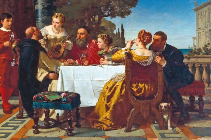 В XVI ВЕКЕ ЖАНР ГРУППОВЫХ ПОРТРЕТОВ И ЖАНРОВЫХ СЦЕНОК ТОЛЬКО НАЧИНАЛ СКЛАДЫВАТЬСЯ, ПРИЧЕМ ПОСЛЕДНИЙ – ПО ПРЕИМУЩЕСТВУ В СТРАНАХ СЕВЕРНОГО ВОЗРОЖДЕНИЯ. ПОЭТОМУ ПРЕДСТАВИТЬ, КАК ИМЕННО МОГЛИ ПИРОВАТЬ В ДОМЕ ТИЦИАНА, МЫ МОЖЕМ ТОЛЬКО ПО ПОДСКАЗКАМ, РАССЫПАННЫМ В КАРТИНАХ ТОГО ВРЕМЕНИ НА РЕЛИГИОЗНЫЕ, МИФОЛОГИЧЕСКИЕ И АЛЛЕГОРИЧЕСКИЕ СЮЖЕТЫ, А ТАКЖЕ БЛАГОДАРЯ ПОПУЛЯРНЫМ В ЭТО ВРЕМЯ ИЗОБРАЖЕНИЯМ КУРТИЗАНОК И МУЗЫКАНТОВ. ПОДОБНЫМИ ВИЗУАЛИЗАЦИЯМИ ОЧЕНЬ ЛЮБИЛИ ЗАНИМАТЬСЯ ИСТОРИЧЕСКИЕ ЖИВОПИСЦЫ XIX ВЕКА, СОЗДАВАВШИЕ КАРТИНЫ, ИЛЛЮСТРИРУЮЩИЕ БИОГРАФИИ СВОИХ ВЕЛИКИХ ПРЕДШЕСТВЕННИКОВ.