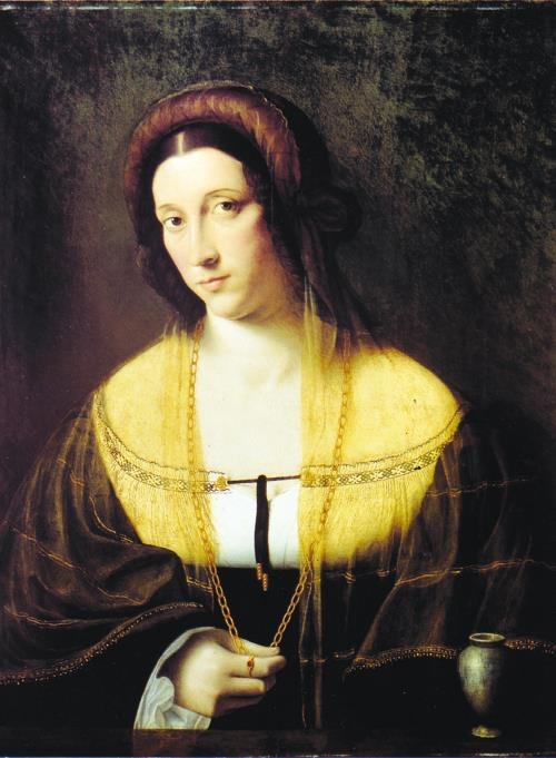 Заказные портреты реальных людей в образе каких-либо святых (но только не Иисуса или Мадонны!) были очень распространены. Часто изображенный и святой носили одно и то же имя, однако это не было обязательным правилом, ассоциации могли быть более сложными. Женщина на этом портрете имеет атрибуты Марии Магдалины – раскаявшейся грешницы: на парапете стоит сосуд для благовоний, а на плечи накинут желтый платок (в ренессансной Италии этот цвет законодательно носили проститутки и куртизанки). Современные исследователи находят в лице модели сходство с «Дамой с горностаем» и предполагают, что изображенная – раскаявшаяся фаворитка Чечилия Галлерани, которой в момент написания этой картины было 45–47 лет.
