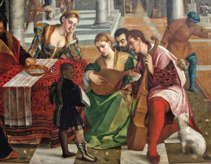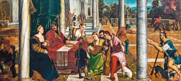 СЮЖЕТ КАРТИНЫ ВЗЯТ ИЗ НОВОЗАВЕТНОЙ ПРИТЧИ – НЕКИЙ БОГАЧ ЕЖЕДНЕВНО РОСКОШНО ПИРОВАЛ, В ТО ВРЕМЯ КАК НИЩИЙ ЛАЗАРЬ СИДЕЛ У ЕГО ВОРОТ И ПРОСИЛ МИЛОСТЫНЮ. ПОСЛЕ СМЕРТИ БОГАЧ ОКАЗЫВАЕТСЯ В АДУ И, УВИДЕВ, ЧТО ЛАЗАРЬ В РАЮ, ПРОСИТ О СНИСХОЖДЕНИИ, В ЧЕМ ЕМУ ОТКАЗАНО, ПОСКОЛЬКУ В ЗЕМНОЙ ЖИЗНИ ОДИН ИЗ НИХ УЖЕ ПОЛУЧИЛ ДОБРОЕ, А ДРУГОЕ ЗЛОЕ. ПЕРВАЯ СЦЕНА ЭТОЙ ПРИТЧИ РАЗВОРАЧИВАЕТСЯ НА КАРТИНЕ В РОСКОШНЫХ ВЕНЕЦИАНСКИХ ИНТЕРЬЕРАХ 1540-Х ГОДОВ: ИЗОБРАЖЕНА ЗАГОРОДНАЯ ВИЛЛА И ДЕТАЛИ ЕЕ ПОВСЕДНЕВНОГО БЫТА.