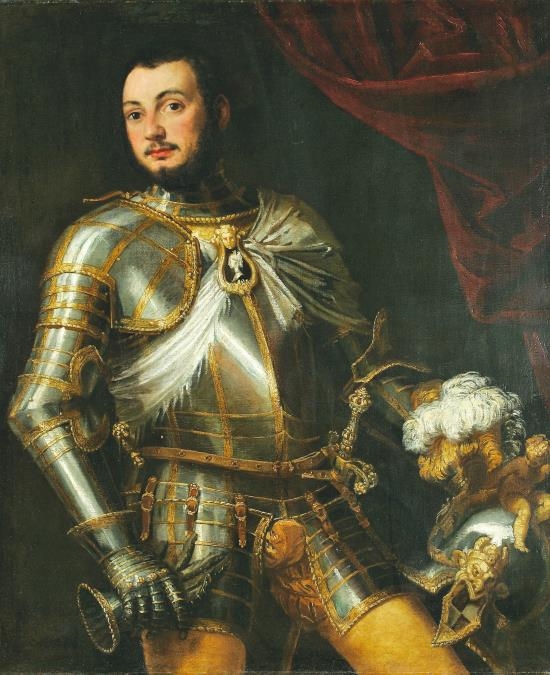 РОСКОШНЫЙ ПОРТРЕТ ИЗОБРАЖАЕТ МОЛОДОГО ЧЕЛОВЕКА В ПАРАДНОМ РАЗЗОЛОЧЕННОМ ДОСПЕХЕ. ДЛЯ СЕРЕДИНЫ XVI ВЕКА ПОДОБНАЯ РАСШИРЕННАЯ ИКОНОГРАФИЯ ДЛЯ ВЕНЕЦИАНСКОГО ПОРТРЕТА УЖЕ БЫЛА СОВЕРШЕННО СТАНДАРТНОЙ.