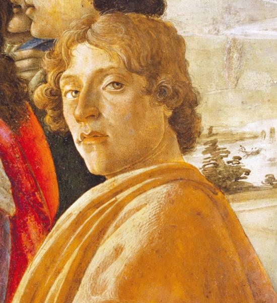 ОТДЕЛЬНЫХ АВТОПОРТРЕТОВ БОТТИЧЕЛЛИ НЕ ОСТАВИЛ, НО ЕГО ВНЕШНОСТЬ НАМ ИЗВЕСТНА. КАК И МНОГИЕ ДРУГИЕ РЕНЕССАНСНЫЕ ХУДОЖНИКИ, ОН ВПИСАЛ СЕБЯ В ТОЛПУ, ПРОЧИЕ ПЕРСОНАЖИ КОТОРОЙ СМОТРЯТ НА БОГА ИЛИ МАДОННУ, В ТО ВРЕМЯ КАК ОН ЕДИНСТВЕННЫЙ – ПРЯМО НА ЗРИТЕЛЯ.