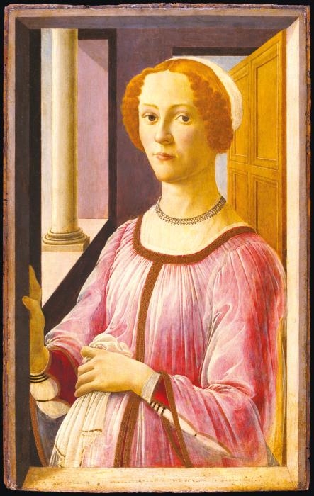 СОХРАНИЛОСЬ НЕСКОЛЬКО ЖЕНСКИХ ПОРТРЕТОВ КИСТИ БОТТИЧЕЛЛИ, И ВСЕ ОНИ, КРОМЕ ЭТОГО, ЯВЛЯЮТСЯ ПРОФИЛЬНЫМ, СОГЛАСНО МОДЕ, КОТОРАЯ К ТОМУ ВРЕМЕНИ ПОСТЕПЕННО НАЧИНАЕТ УСТАРЕВАТЬ. В МУЖСКИХ ПОРТРЕТАХ БОТТИЧЕЛЛИ БЫЛ ГОРАЗДО СВОБОДНЕЙ – ВСТРЕЧАЮТСЯ И ИЗОБРАЖЕНИЯ В ТРИ ЧЕТВЕРТИ, И ПОЧТИ ФАС (ОДНАКО ПОЛНОГО РАЗВОРОТА В ФАС, КАК В ЗНАМЕНИТОМ «АВТОПОРТРЕТЕ» ДЮРЕРА 1500 ГОДА, ОН СЕБЕ НЕ ПОЗВОЛЯЕТ). КРОМЕ ТОГО, ЭТО САМЫЙ КРУПНОФОРМАТНЫЙ ИЗ ЕГО ЖЕНСКИХ ПОРТРЕТОВ – ОН НЕ ПОГРУДНЫЙ И НЕ ПОЯСНОЙ, А СО СРЕЗОМ ПО БЕДРА, ЧТО, ПОМИМО ПРОЧЕГО, ПОЗВОЛЯЕТ ЕМУ НАГЛЯДНО ВЫПИСАТЬ ЯВНО БЕРЕМЕННЫЙ ЖИВОТ ИЗОБРАЖЕННОЙ. ПОРТРЕТЫ БЕРЕМЕННЫХ ЖЕНЩИН ВПОСЛЕДСТВИИ ПОЛУЧАТ БОЛЬШОЕ РАСПРОСТРАНЕНИЕ – В ЭПОХУ, КОГДА КАЖДЫЕ РОДЫ БЫЛИ РИСКОМ ДЛЯ ЖИЗНИ, ЗАКАЗЫВАТЬ ТАКИЕ ИЗОБРАЖЕНИЯ МАТЕРИ СЕМЕЙСТВА БЫЛО ПРЕДУСМОТРИТЕЛЬНО.