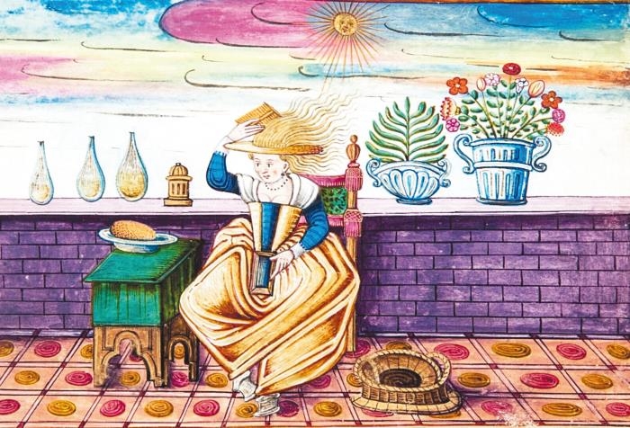 ИЗОБРАЖЕНИЕ СЛОЖНОГО ПРОЦЕССА ОБЕСЦВЕЧИВАНИЯ ВОЛОС ТИПИЧНОЙ ВЕНЕЦИАНКОЙ.